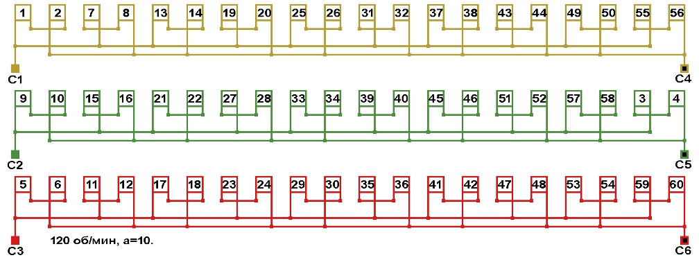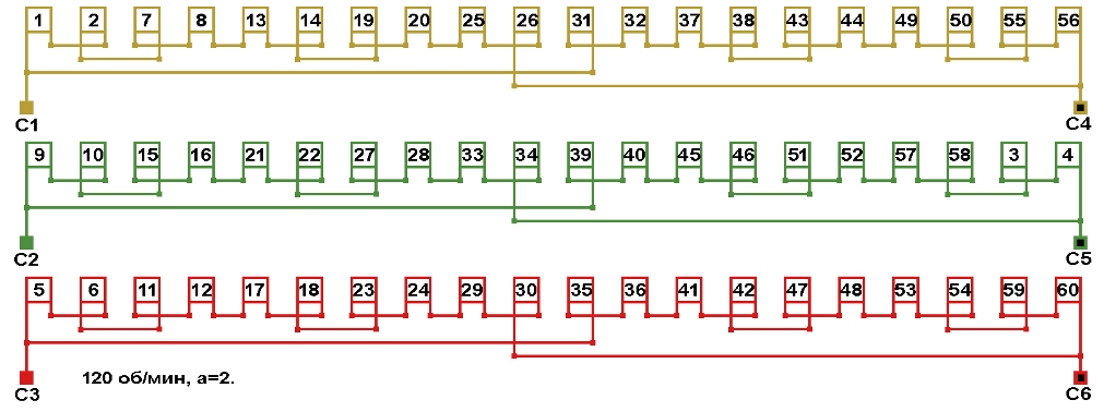 Схема соединений обмотки электродвигателя 120 об/мин. 2p=50.