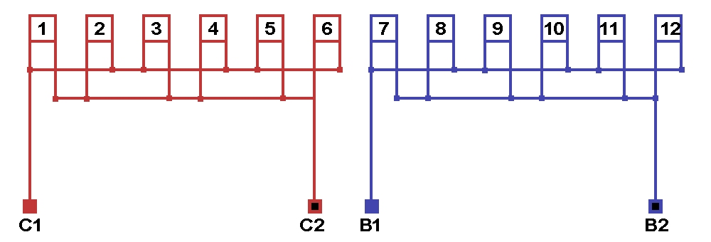 Схема соединений однофазной обмотки, количество параллельных ветвей а=6.