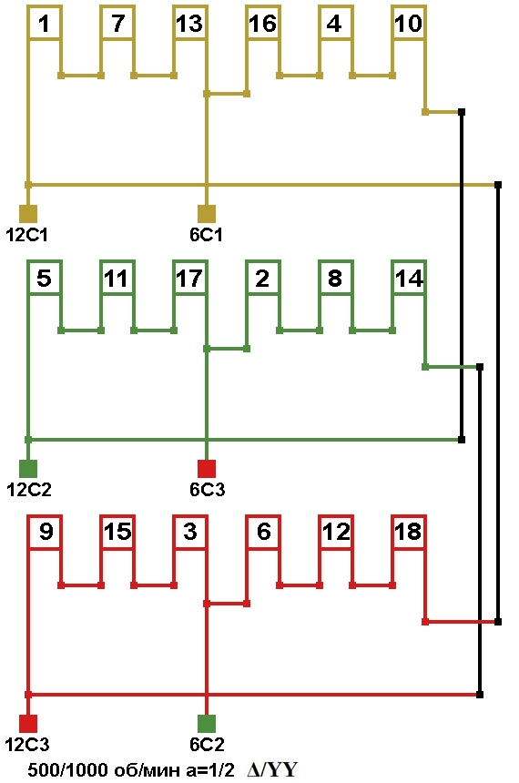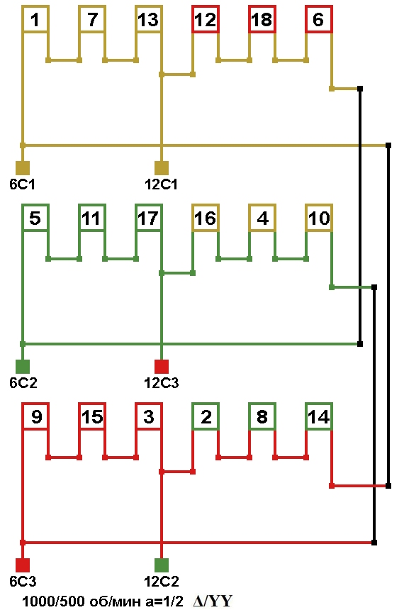 Схема соединений двухскоростной обмотки. 2p=6/12, 1000/500 об/мин., а=1/2, соединение фаз Δ/YY.