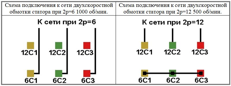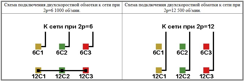 Схемы соединений и подключения двухскоростных обмоток. 2p=6/12, 1000/500 об/мин.