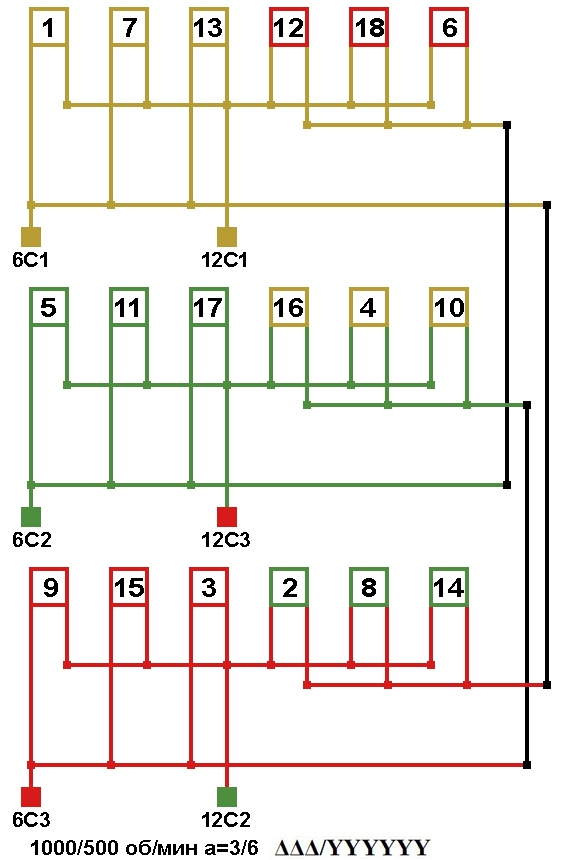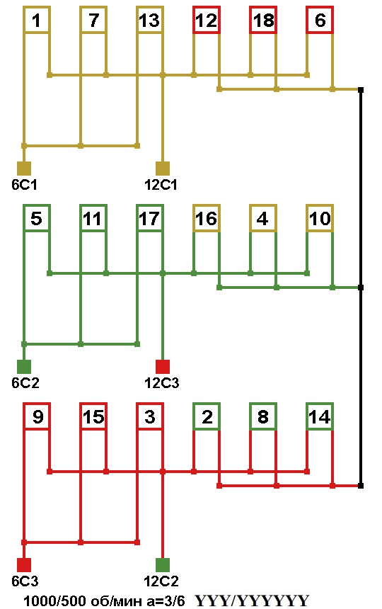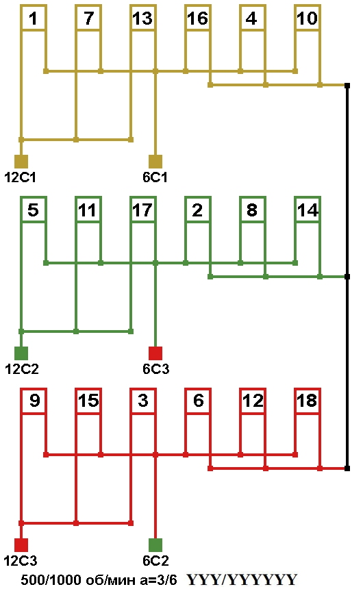 Схема соединений двухскоростной обмотки. 2p=12/6, 500/1000 об/мин., а=3/6, соединение фаз YYY/YYYYYY.