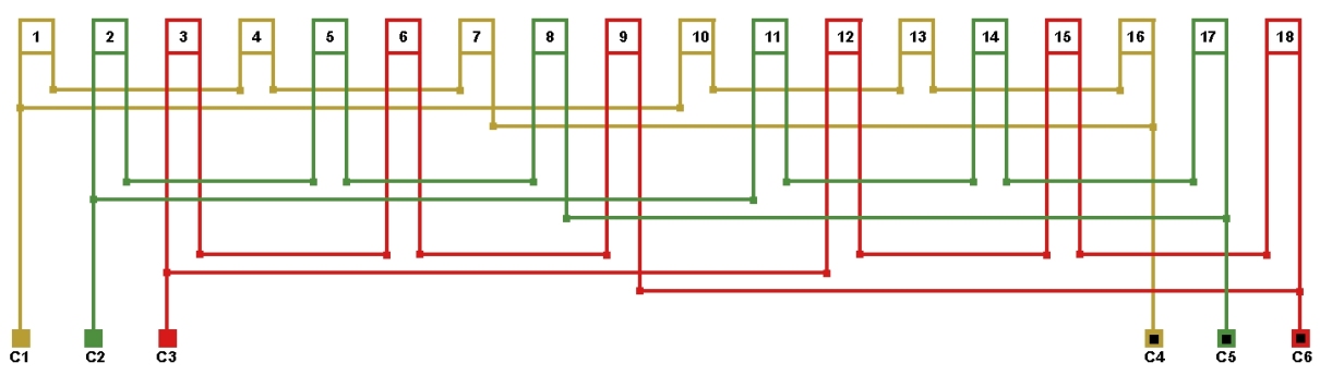 Схема соединений однослойной обмотки электродвигателя 500 об/мин. 2p=12, количество параллельных ветвей: а=2.