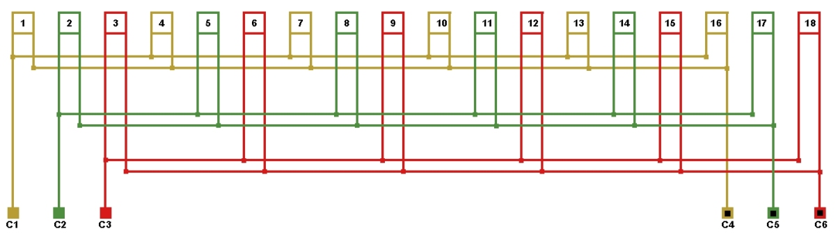 Схема соединений однослойной обмотки электродвигателя 500 об/мин. 2p=12, количество параллельных ветвей: а=6.