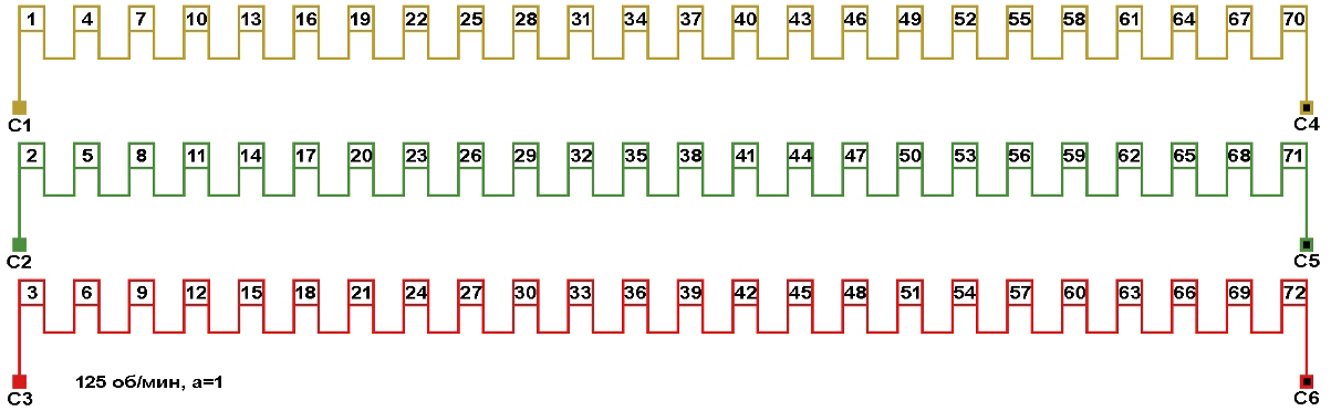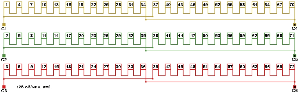 Схема соединений обмотки электродвигателя 125 об/мин. 2p=48.