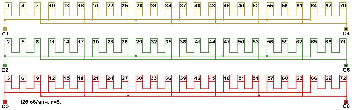 Схема соединений обмотки, количество параллельных ветвей а=8.