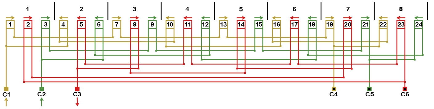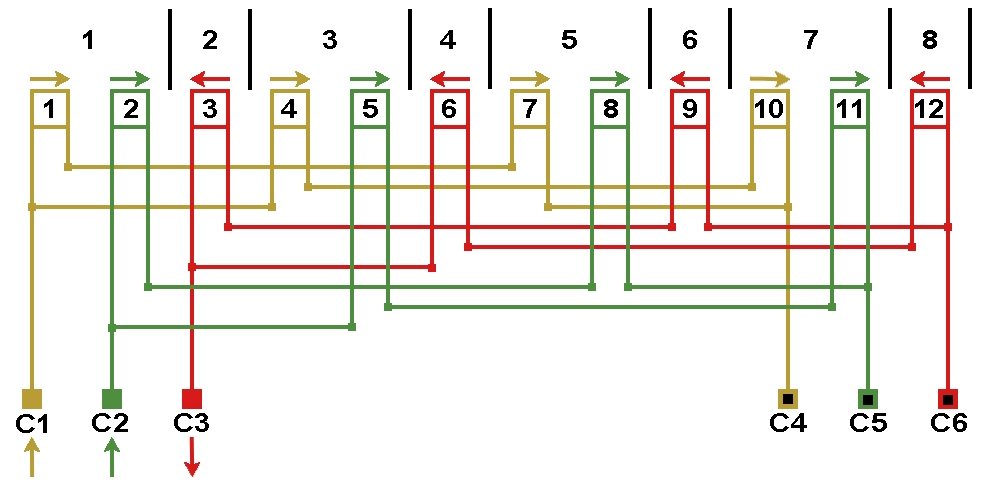Схема соединений обмоток электродвигателей 750 об/мин. 2p=8, количество параллельных ветвей а=2, вариант №2.