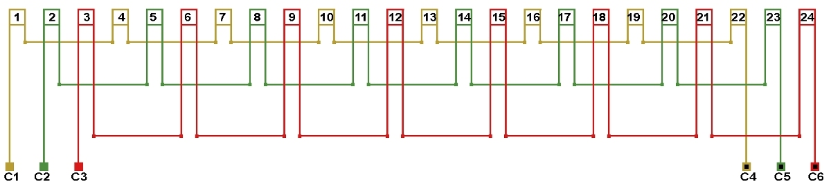 Схема соединений однослойной обмотки электродвигателя 375 об/мин. 2p=16, количество параллельных ветвей: а=1.