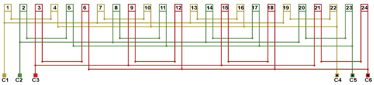 Схема соединений однослойной обмотки электродвигателя 375 об/мин. 2p=16, количество параллельных ветвей: а=4.