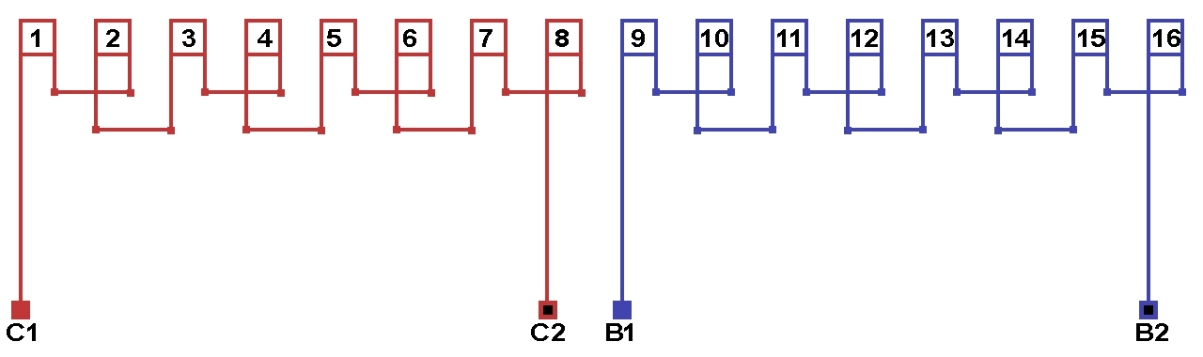 Схема соединений однофазной обмотки, количество параллельных ветвей а=1.