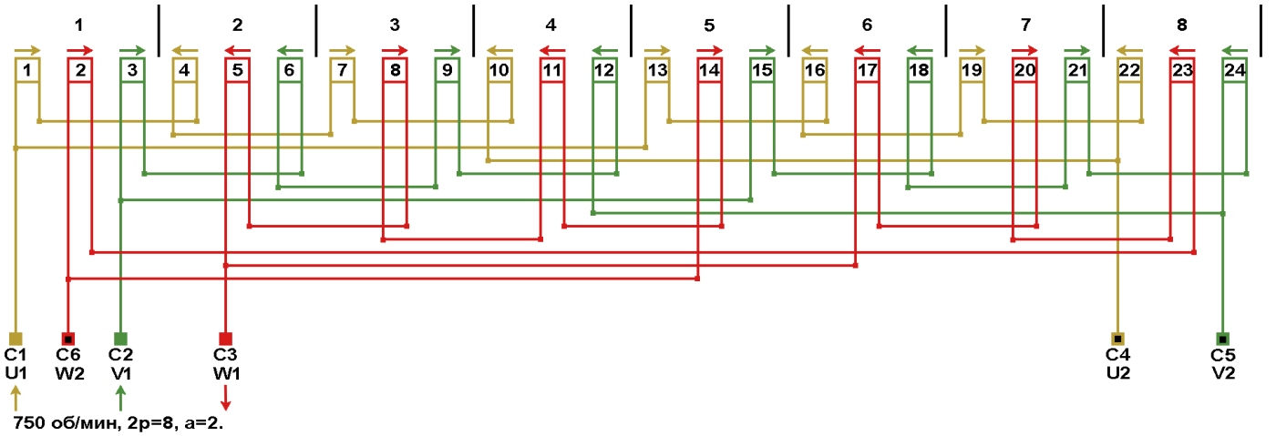 Схемы соединений двухслойных обмоток электродвигателей 750 об/мин. 2p=8, количество параллельных ветвей: а=2.