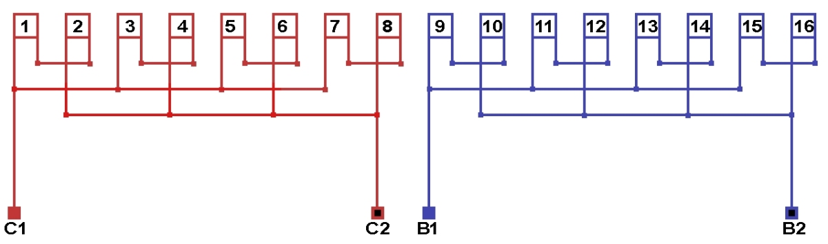 Схема соединений однофазной обмотки, количество параллельных ветвей а=4.