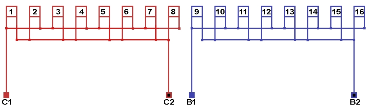 Схема соединений однофазной обмотки, количество параллельных ветвей а=8.