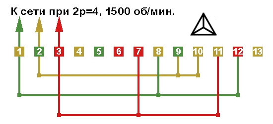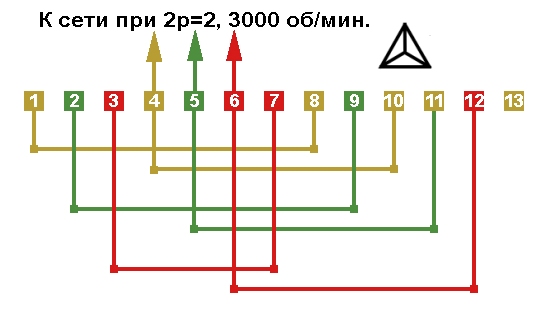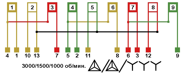 Схема соединений трехскоростной обмотки. 2p=2/4/6, 3000/1500/1000 об. мин., соединение фаз Δ/Δ/YYY.