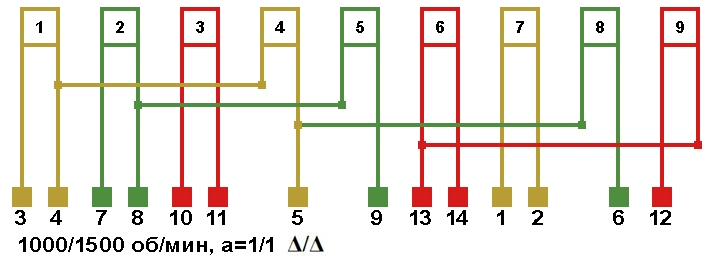 Схема соединений двухскоростной обмотки. 2p=6/4, 1000/1500 об/мин., соединение фаз Δ/Δ.