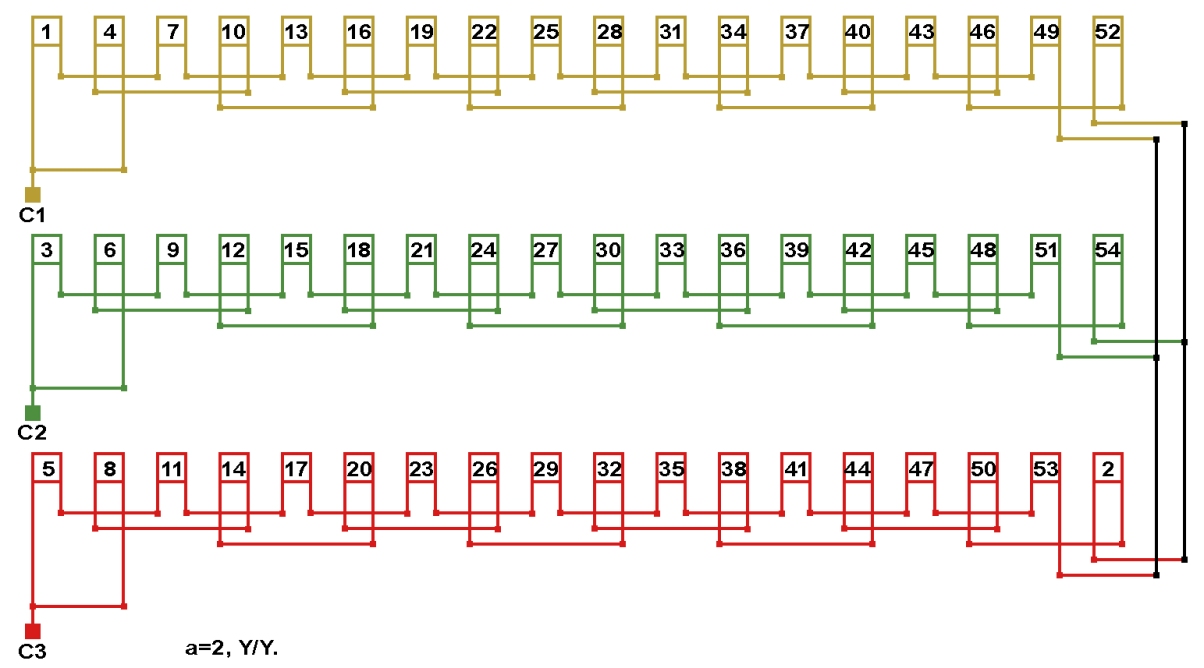 Схема соединений двухслойной обмотки электродвигателя 333 об/мин. 2p=18, количество параллельных ветвей: а=2.