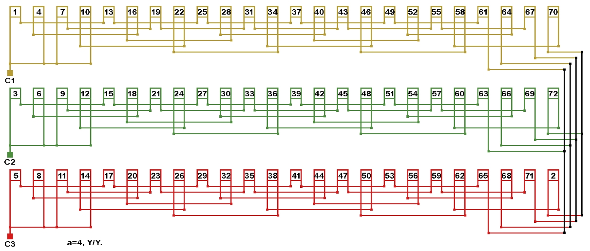 Схема соединений двухслойной обмотки электродвигателя 250 об/мин. 2p=24, количество параллельных ветвей: а=2, а=4.