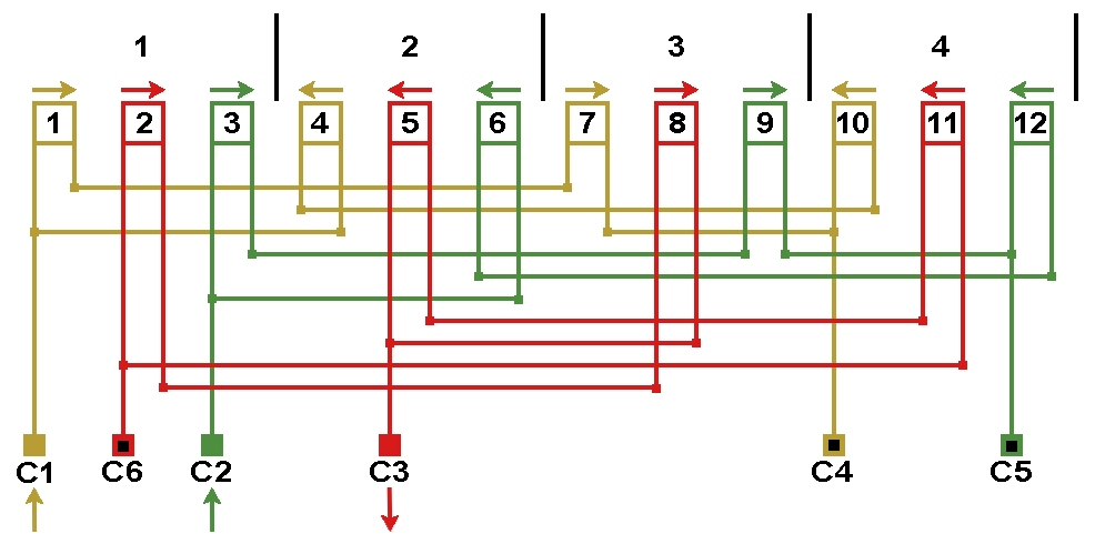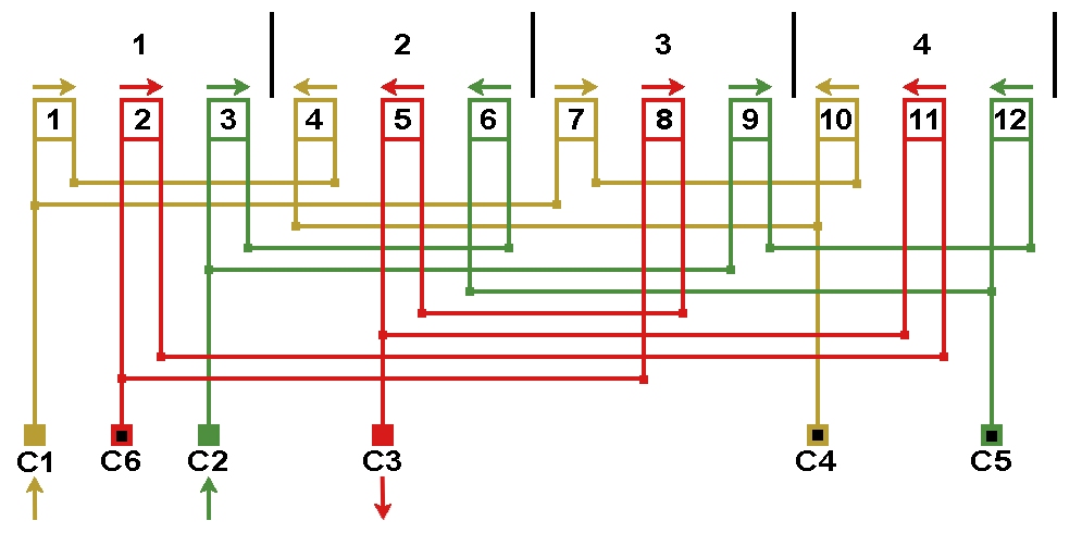 - Двухслойную обмотку решили заменить однослойной, рисунок 4. Проверяем возможность применения схемы соединений рисунка 2 (в данном примере в одной фазе). В первой фазе в одной ветви катушки 1 и 7 обе двухсекционные, а во второй ветви односекционные катушки 4 и 10. Схему соединений с рисунка 2 для этой однослойной обмотки применять нельзя, так как параллельные ветви несимметричны по числу витков. Схему соединений по рисунку 1 возможно применить, в одной ветви катушки 1 и 4 во второй ветви катушки 7 и 10.