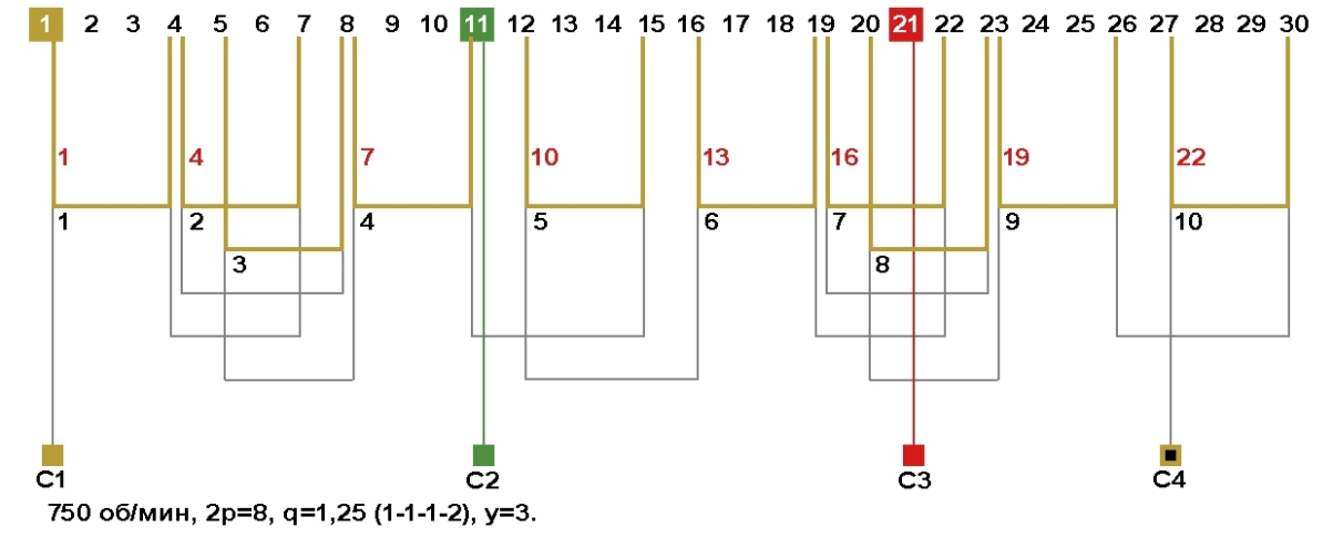 Для примера возьмём двигатель с количеством пазов Z1=30, 750 об/мин, у=3.