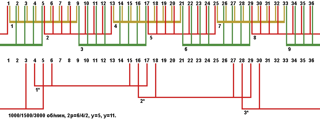 Схема укладки трехскоростной обмотки. Z1=36, 2p=6/4/2, 1000/1500/3000 об/мин., шаг у=5 и у=11, соединение фаз YYY/Δ/Δ.