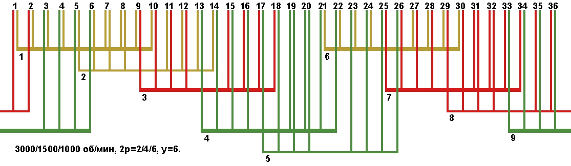 Схема укладки трехскоростных обмоток. Z1=36, 2p=6/4/2, 1000/1500/3000 об/мин.