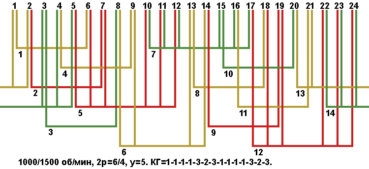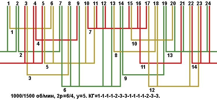 Схемы укладки двухскоростных обмоток. Z1=24, 2p=6/4, 1000/1500 об/мин.
