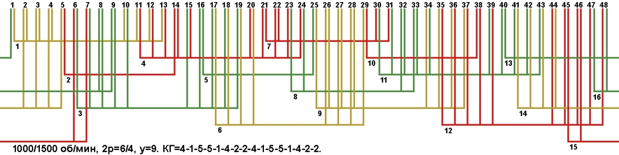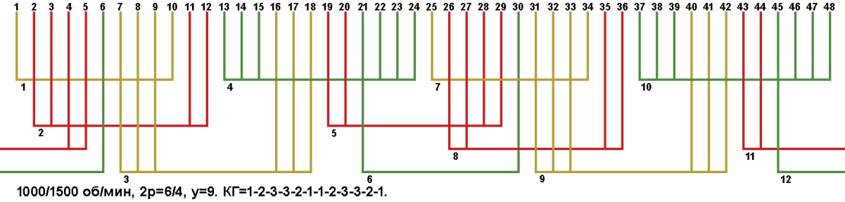 Схема укладки двухскоростной обмотки. Z1=48, 2p=6/4, 1000/1500 об/мин., шаг у=9, а=1/2, соединение фаз Δ/YY, Y/YY.