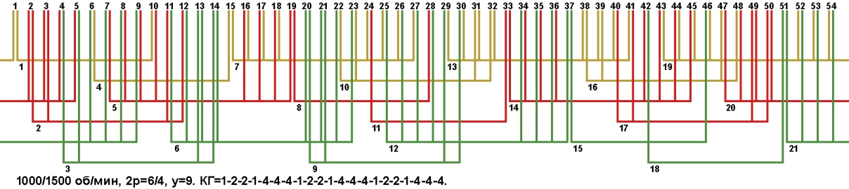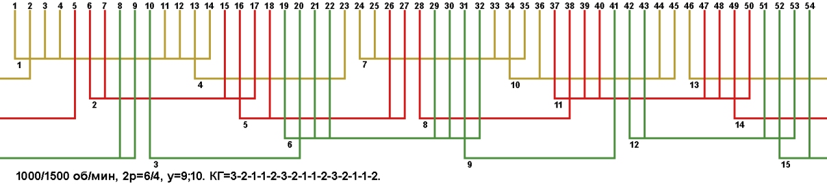Схема укладки двухскоростной обмотки. Z1=54, 2p=6/4, 1000/1500 об/мин., шаг у=9, соединение фаз YYY/YYY, а=3.