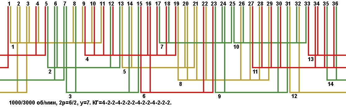 Схемы укладки двухскоростных обмоток. Z1=36, 2p=6/2, 1000/3000 об/мин.