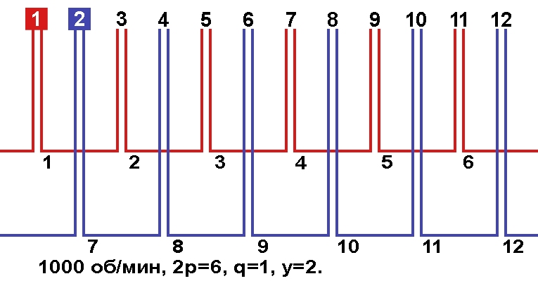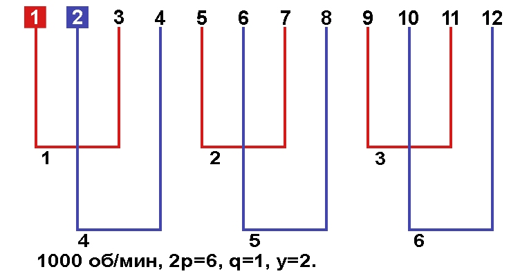 Схема укладки обмотки однофазного электродвигателя с количеством пазов 12, 2p=6 1000 об/мин.