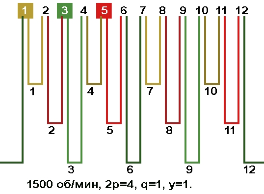 Схемы укладки обмоток электродвигателей с количеством пазов 12, 2p=4 1500 об/мин.