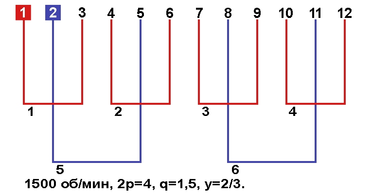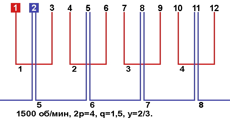 Схема укладки обмотки однофазного электродвигателя с количеством пазов 12, 2p=4 1500 об/мин.