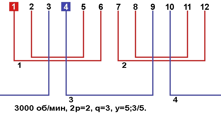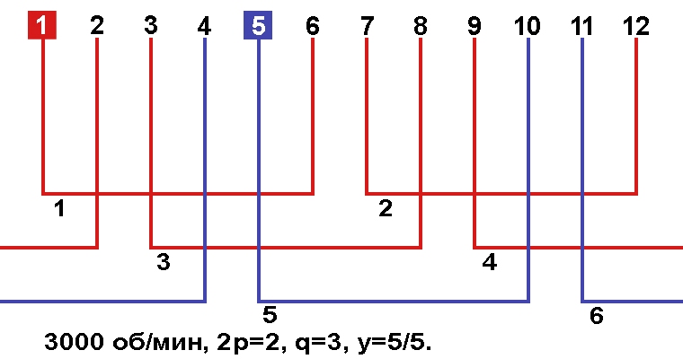 Схема укладки обмотки однофазного электродвигателя с количеством пазов 12, 2p=2 3000 об/мин.