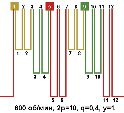 Схема укладки обмотки электродвигателя с количеством пазов 12, 2p=10 600 об/мин.