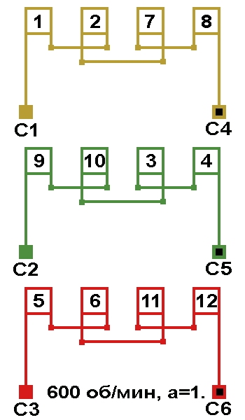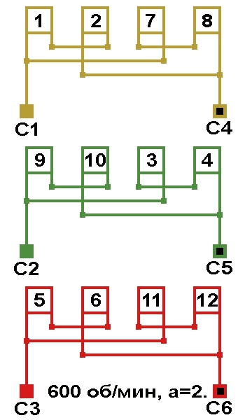 | Начало фаз по пазам | C1;C2;C3 | 1;9;5 |