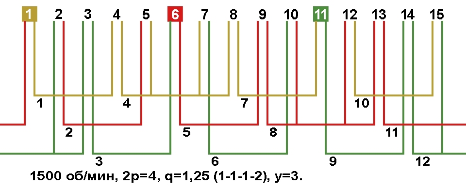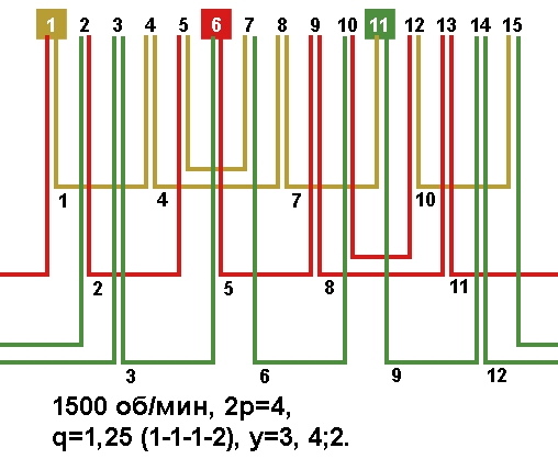 Схема укладки обмотки электродвигателя с количеством пазов 15, 2p=4 1500 об/мин.