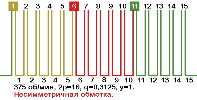 | Порядок чередования катушечных групп в периоде при дробном "q" | 1-1-1-1-1-1-1-1-1-1-1-1-1-1-1-0; | |