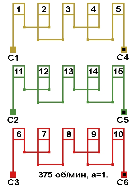 | Начало фаз по пазам | C1;C2;C3 | 1;11;6 несимметричная обмотка |