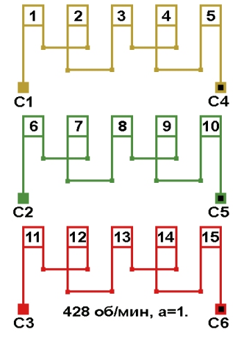 | Начало фаз по пазам | C1;C2;C3 | 1;6;11 несимметричная обмотка |