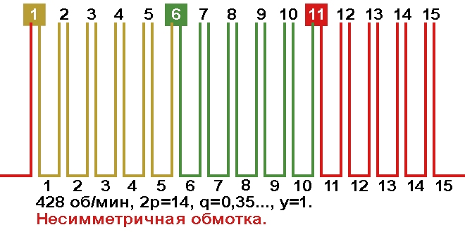 Схемы обмоток синхронных электродвигателей на постоянных магнитах. Количество пазов 15, 2p=14 428 об/мин.