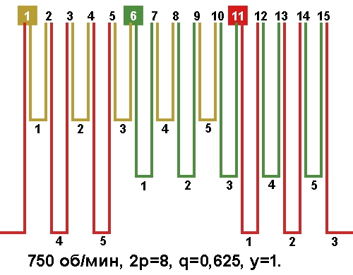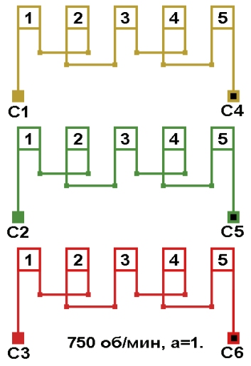 Схемы укладки обмоток электродвигателей с количеством пазов 15, 2p=8 750 об/мин.