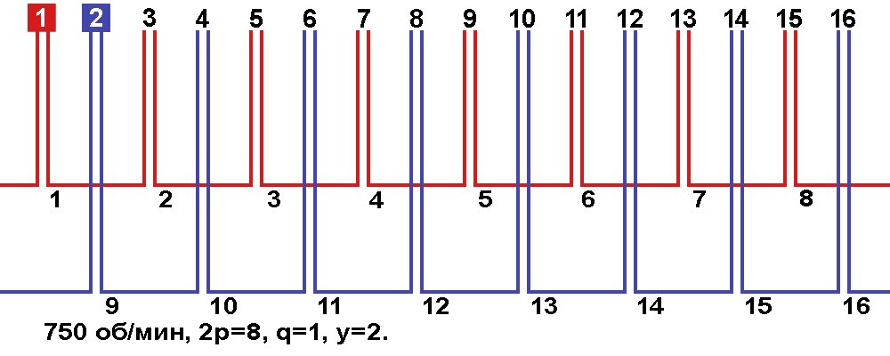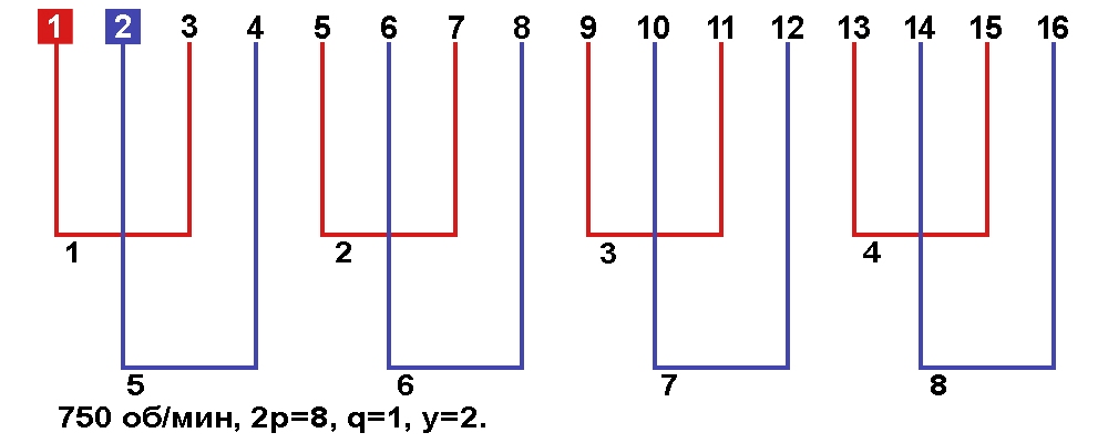 Схема укладки обмотки однофазного электродвигателя с количеством пазов 16, 2p=8 750 об/мин.