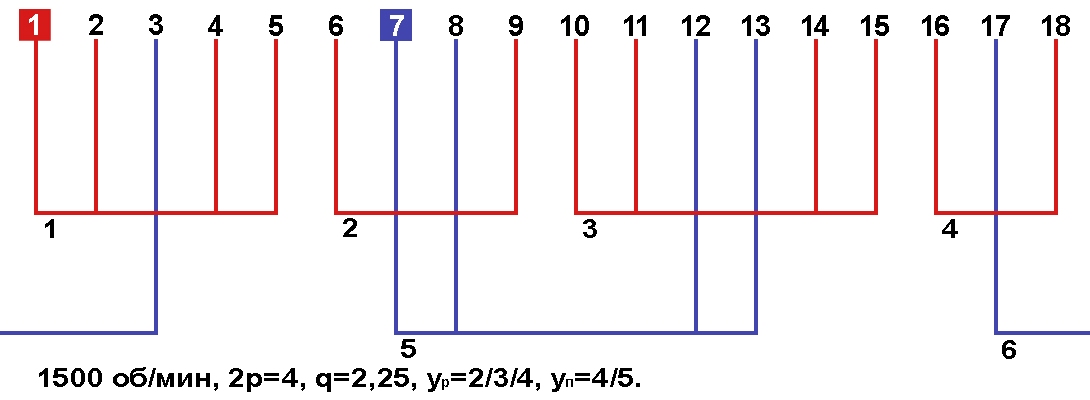Схема укладки обмотки однофазного электродвигателя с количеством пазов 18, 2p=4 1500 об/мин.