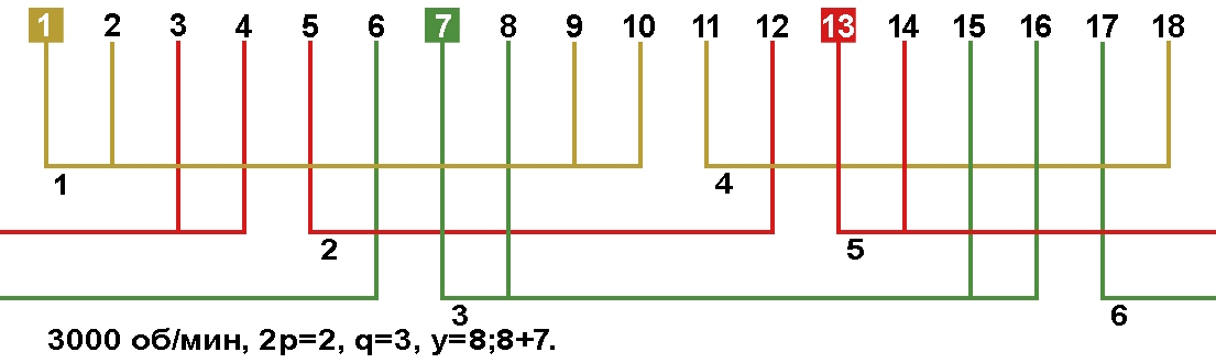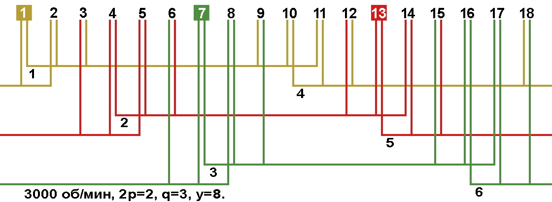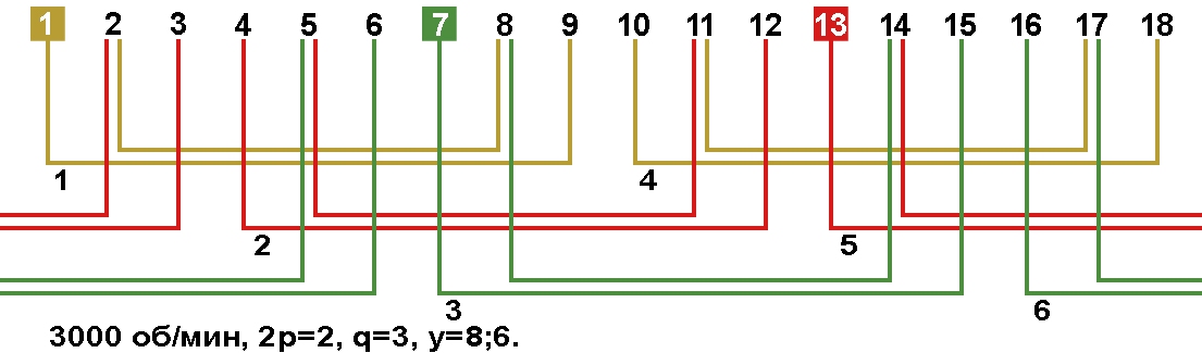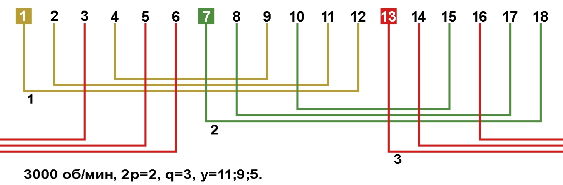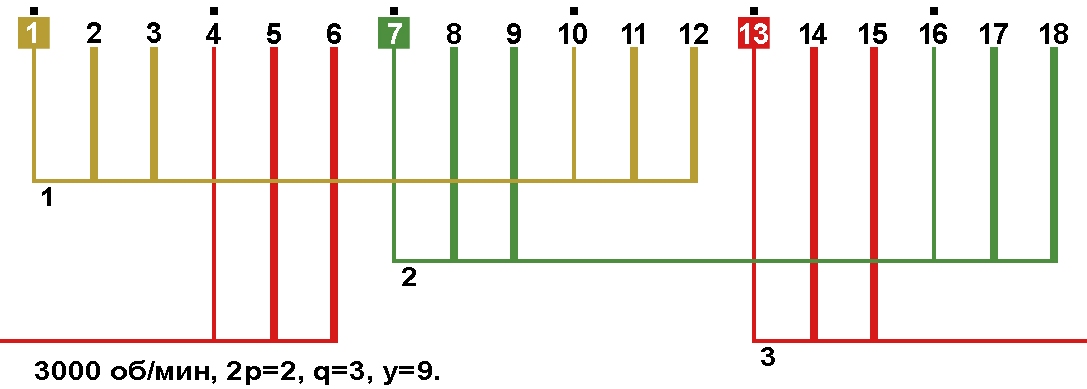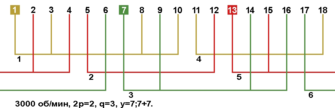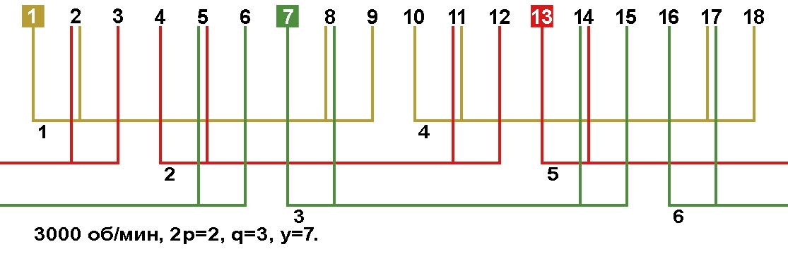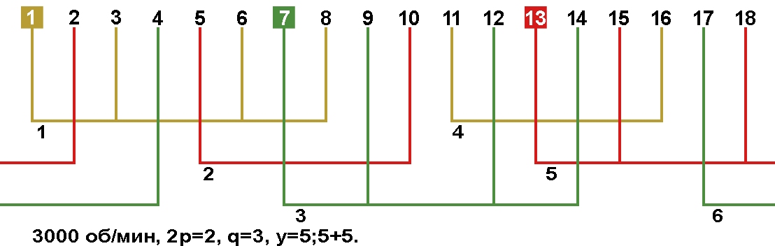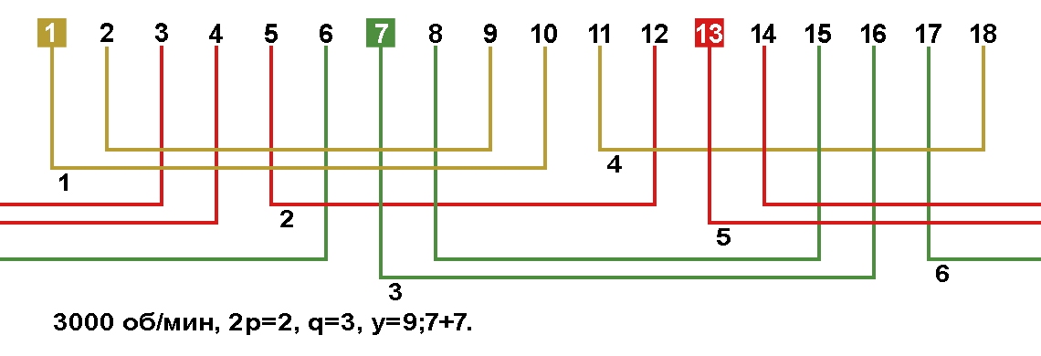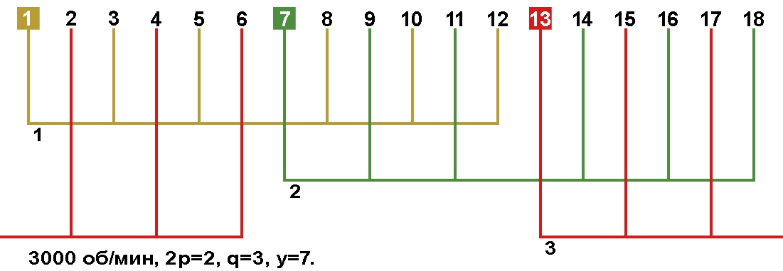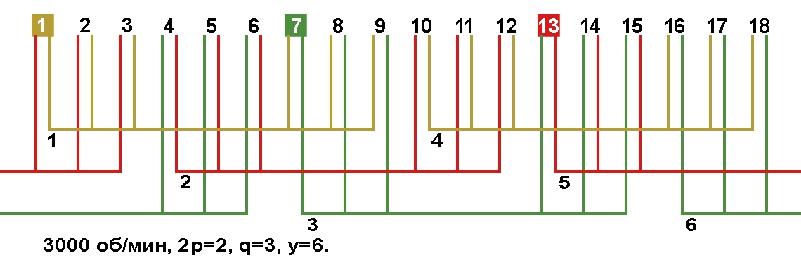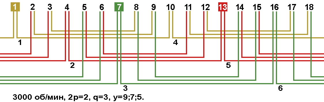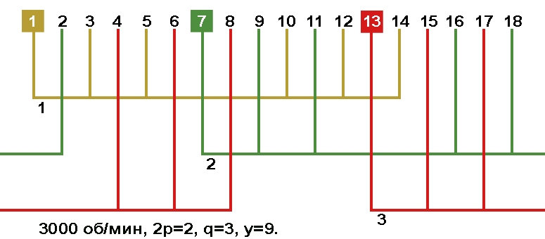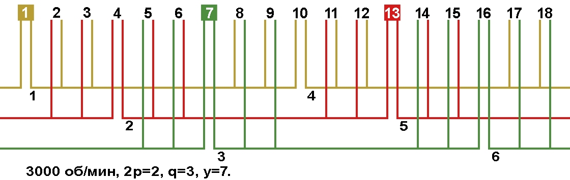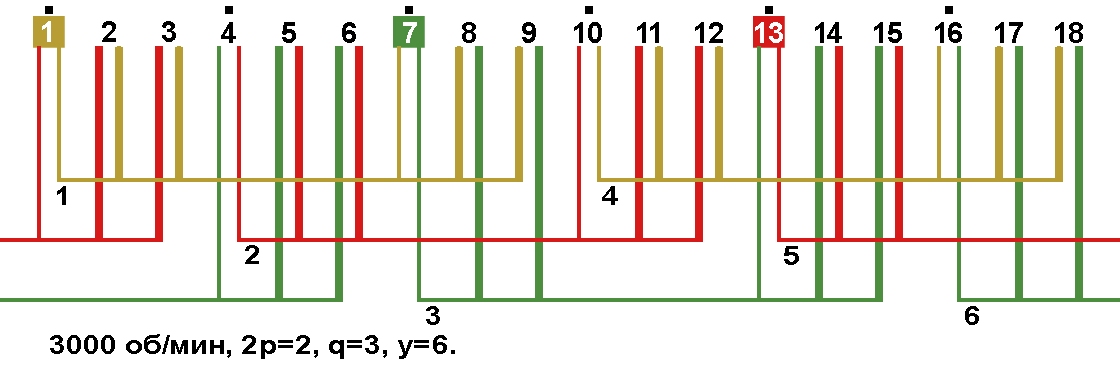 | Начало фаз по пазам | C1;C2;C3 | 1;7;13 |