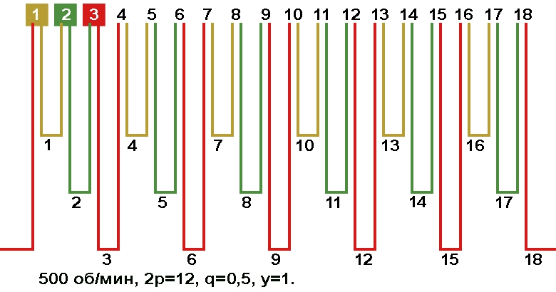 | Начало фаз по пазам | C1;C2;C3 | 1;2;3 |