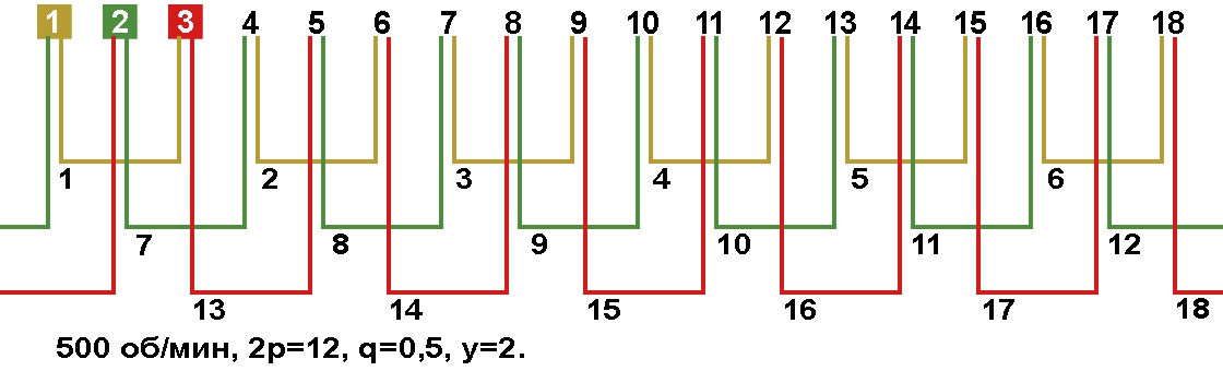 Схема укладки двухслойной обмотки у=2, возможное количество параллельных ветвей а=1, a=2, a=3, a=6.