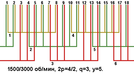 Схемы укладки двухскоростных обмоток. Z1=18, 2p=4/2 1500/3000 об/мин.