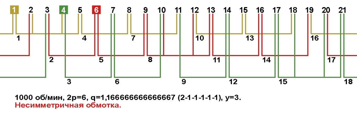 Схема укладки несимметричной обмотки электродвигателя с количеством пазов 21, 2p=6 1000 об/мин.