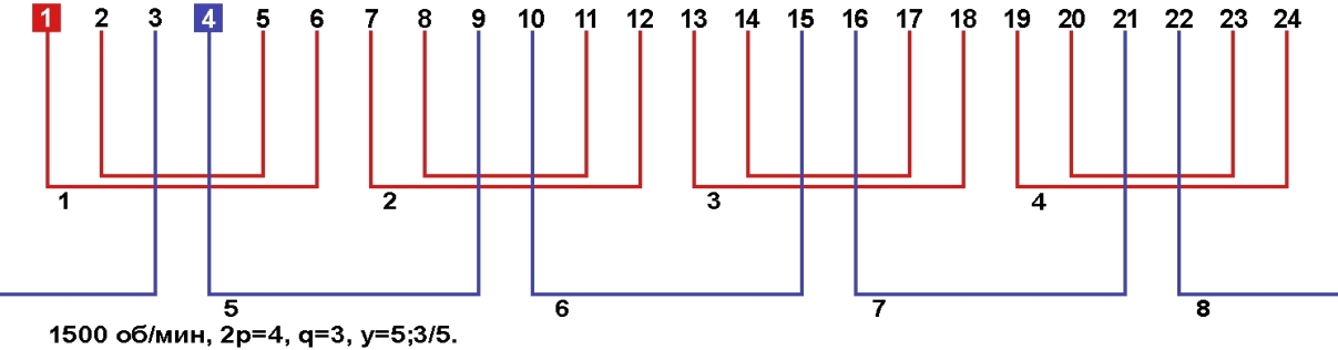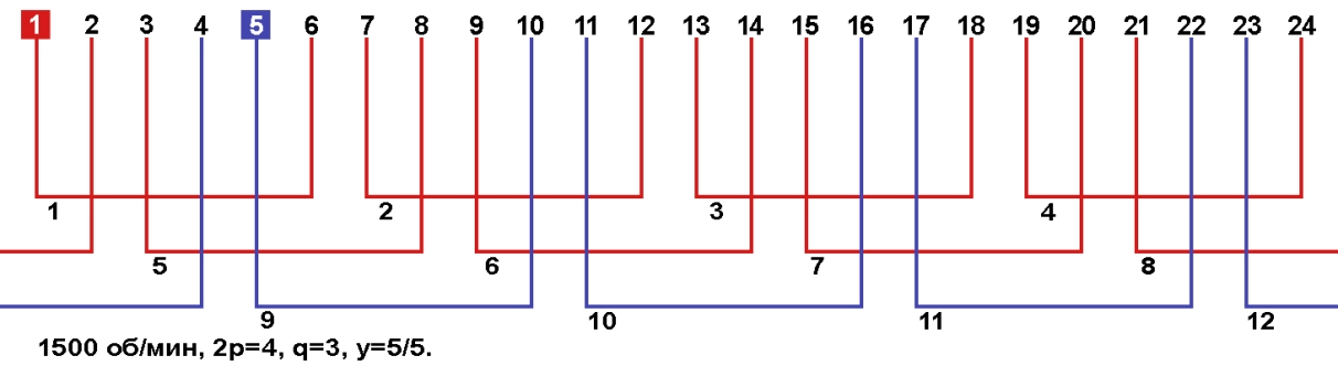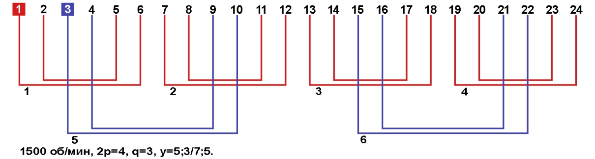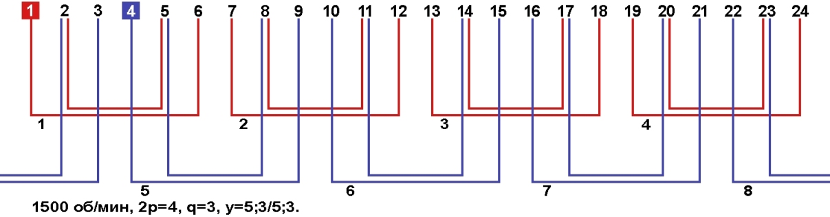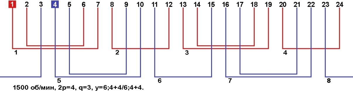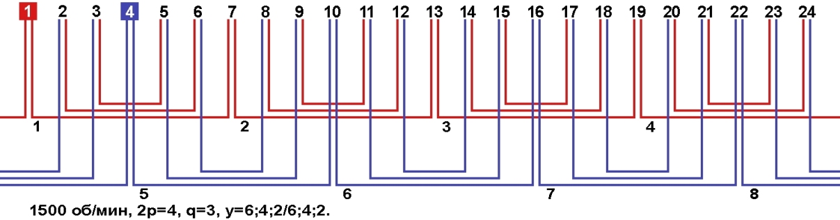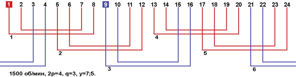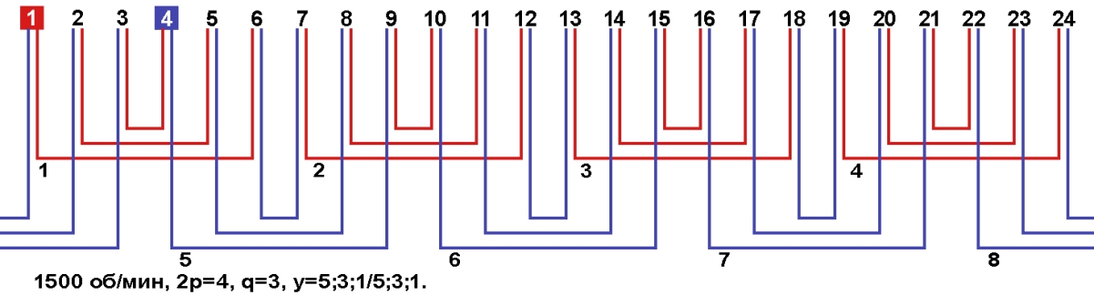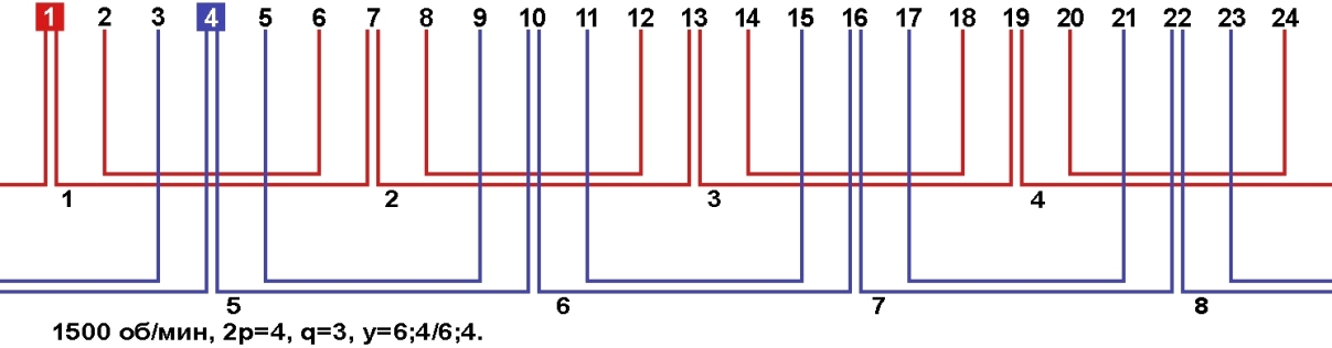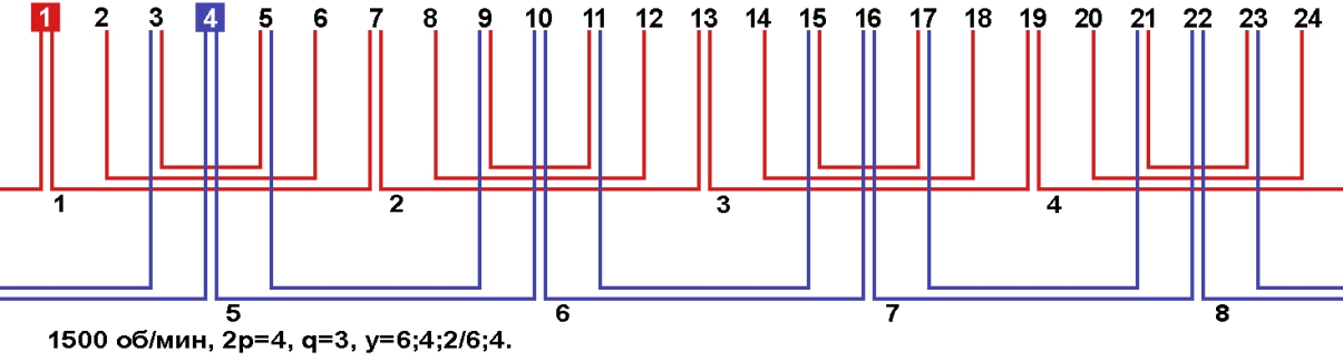 Схемы укладки обмоток однофазных электродвигателей с количеством пазов 24, 2p=4 1500 об/мин.