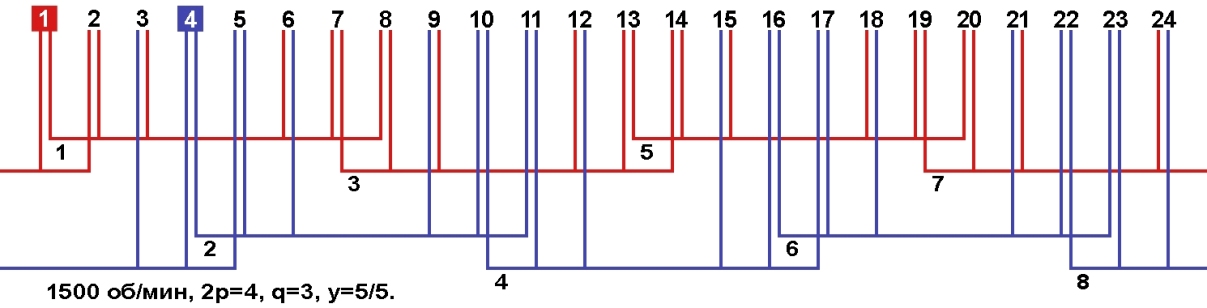 Схема укладки однофазной двухслойной обмотки. Шаг: рабочей обмотки у=4, пусковой обмотки у=4. Возможное количество параллельных ветвей а=1, а=2, а=4.