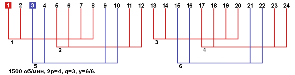 Схема укладки однофазной обмотки. Шаг: рабочей обмотки у=6, пусковой обмотки у=6. Возможное количество параллельных ветвей: рабочей обмотки а=1, а=2, а=4, пусковой обмотки а=1, а=2.